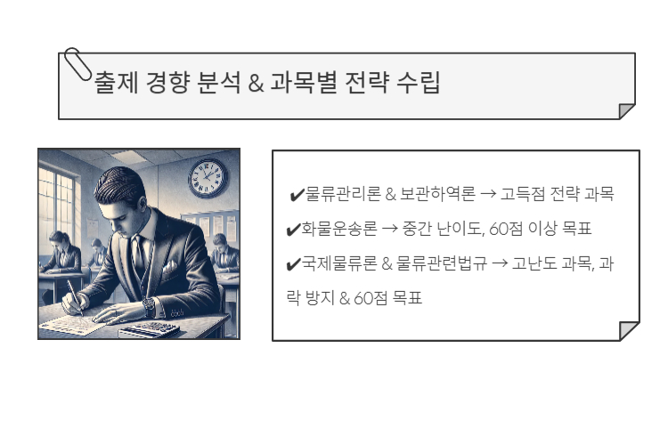 ✅ 1교시 과목(물류관리론, 화물운송론, 국제물류론)에서 고득점하여 2교시 과목(물류관련법규) 부담 최소화!