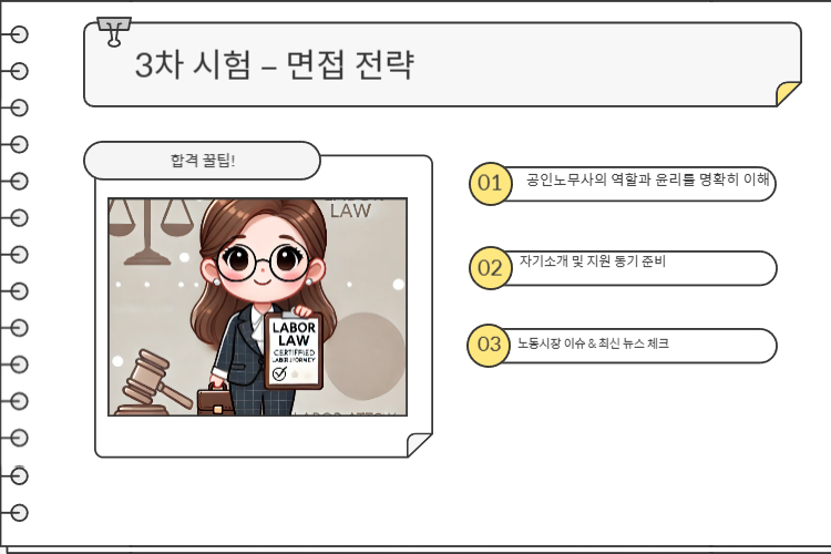 - 공인노무사의 역할과 윤리, 전문지식 등을 평가하는 면접