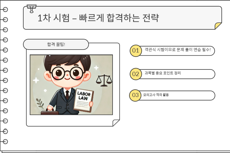 공인노무사 시험은 1차(객관식), 2차(논술형), 3차(면접)으로 구성됩니다.