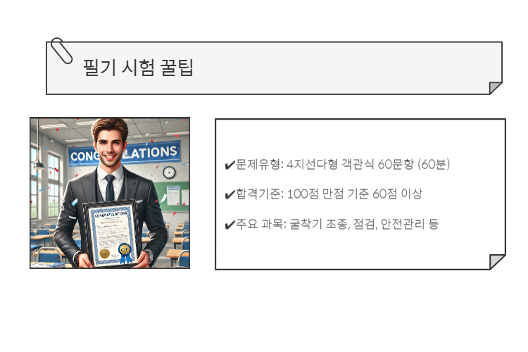 - 시험형태: 필기(객관식 60문항) + 실기(작업형: 주행시험 + 굴착시험)