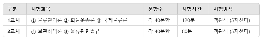 - 대상: 물류관리론·화물운송론·보관하역론·국제물류론 과목을 포함한 대학원 석사학위 소지자