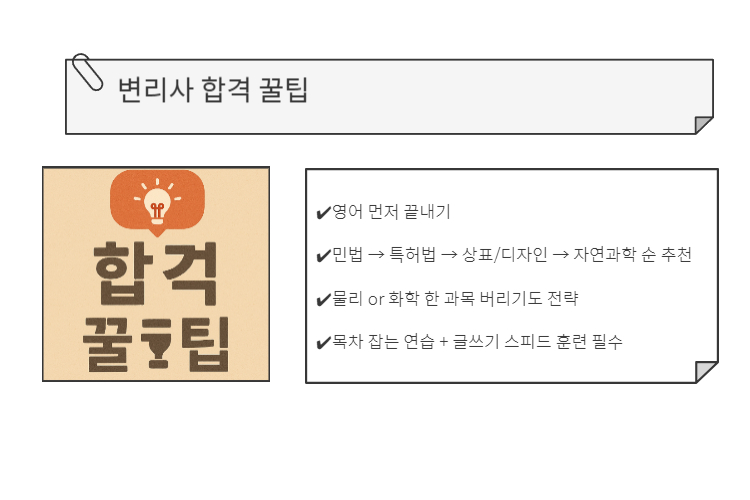 - 민법 → 특허법 → 상표/디자인 → 자연과학 순 추천