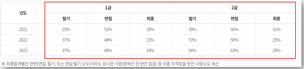 - 최종합격률: 1급(2023년 기준) 14%, 2급 29%