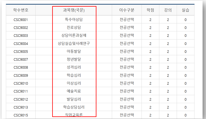 - 이수 과목 예시: 심리치료, 상담심리학, 가족상담, 심리평가, 이상심리학 등.