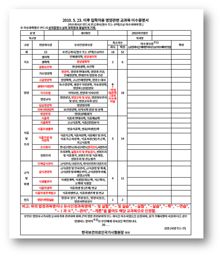 - 교과목 및 학점 요건: 영양 관련 교과목 18과목(52학점) 이수.