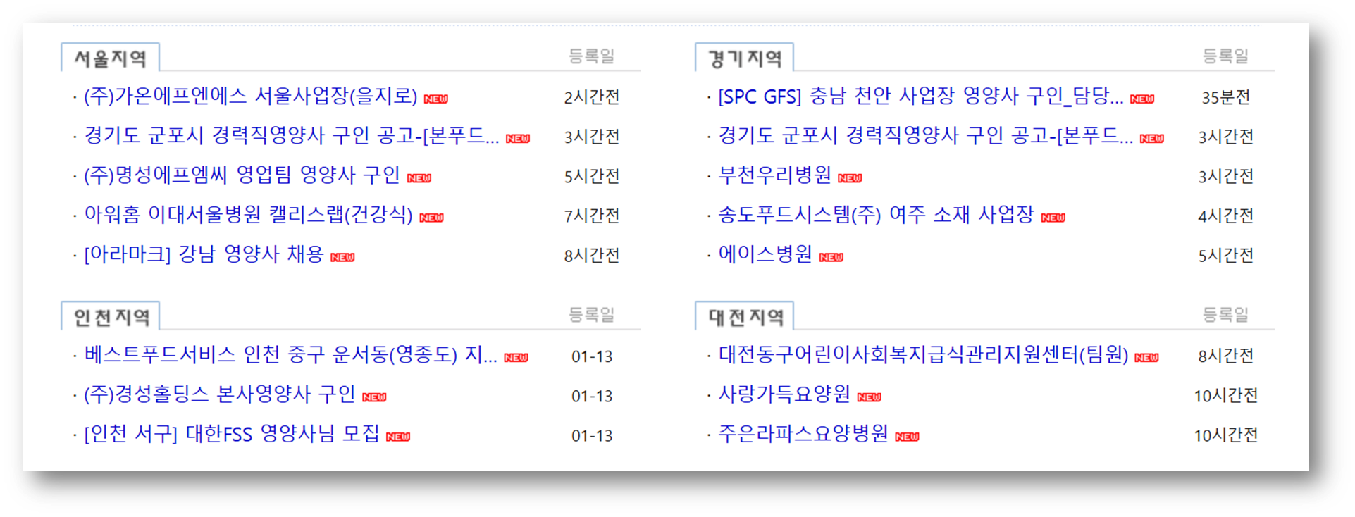 아래 그림은 대표적 영양사 구인 사이트인 영양사 도우미 사이트이고요, 많은 정보를 담고 있어, 예비 영양사들에게도 좋은 사이트입니다.