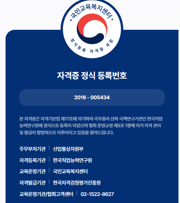 이 교육기관은 산업통상자원부와 한국직업능력연구원이 인정한 공식 자격증 과정을 제공합니다.