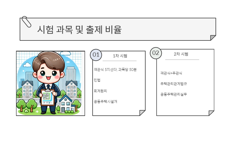 - 공동주택시설개론: 일반 건축 및 설비 이론 50%, 장기수선계획 관련 건축 지식 50%