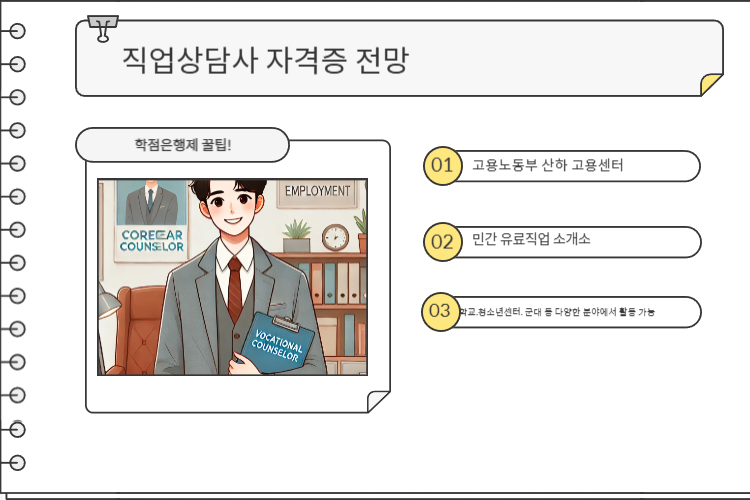 - 학교, 군대, 병원 등에서도 직업 상담 업무 수행 가능.