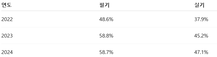 최근 합격률 상승! 특히 필기 합격률은 60% 가까이 유지 중