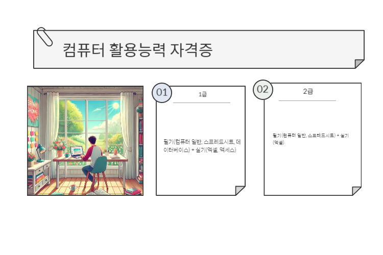 - 2급: 필기(컴퓨터 일반, 스프레드시트) + 실기(엑셀)
