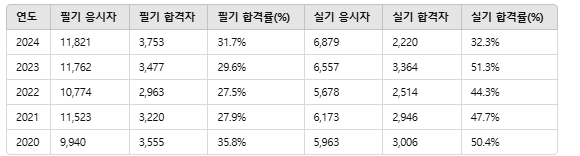 💡 필기 합격률은 평균 30% 내외로 매우 낮지만, 실기 합격률은 40~50% 수준입니다.