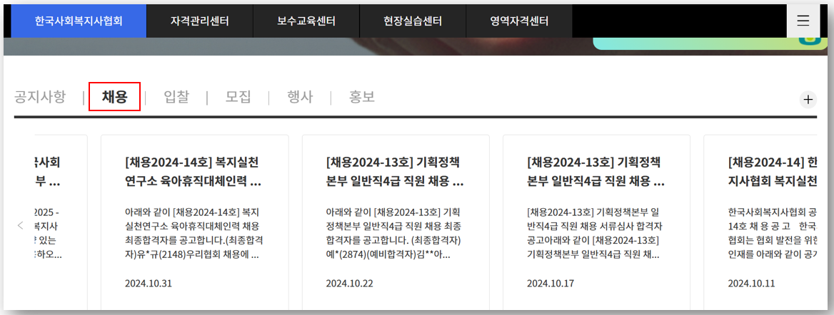 사회복지사협회 홈페이지에서 채용 공고를 열람해볼 수 있는데요, 해당 사이트를 통해 채용 공고를 살펴보셔도 좋을 거 같습니다.
