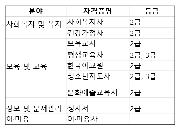 학점은행제로 취득할 수 있는 자격증은 다음과 같아요. 학점은행제를 통해, 필요 학위 및 필수 이수 과목을 이수한 후에 취득할 수 있는 자격증들인데요, 사회복지사 2급의 경우에도 대학교에서 전공을 하지 않았더라도 학점은행제를 통해 학위 취득 후, 취득할 수 있는 자격증입니다.