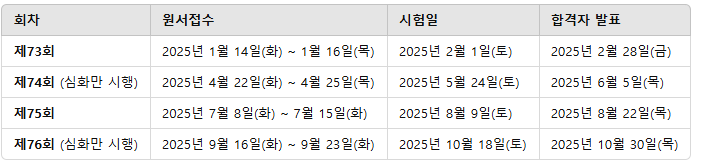 2025년에는 총 4회 시험이 시행되며, 각 회차별 시험 일정은 아래와 같습니다.