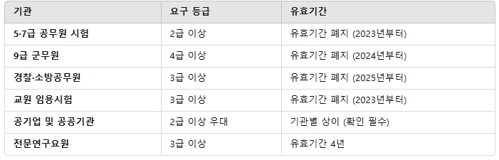 ✅ 하지만, 공무원 및 공기업 채용에서 요구하는 유효기간이 다를 수 있으므로 반드시 지원하려는 기관의 공고를 확인해야 합니다.
