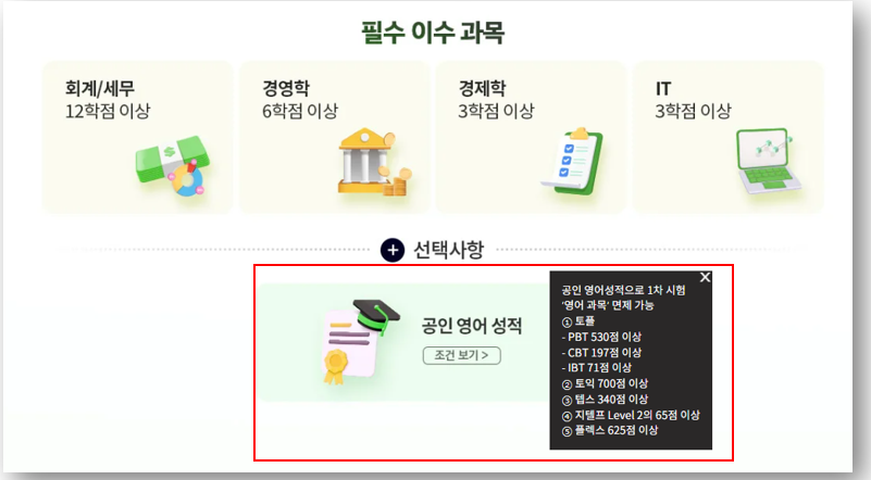 - 공인영어시험(토익, 토플, 텝스 등)의 필수 점수를 취득해야 응시 가능
